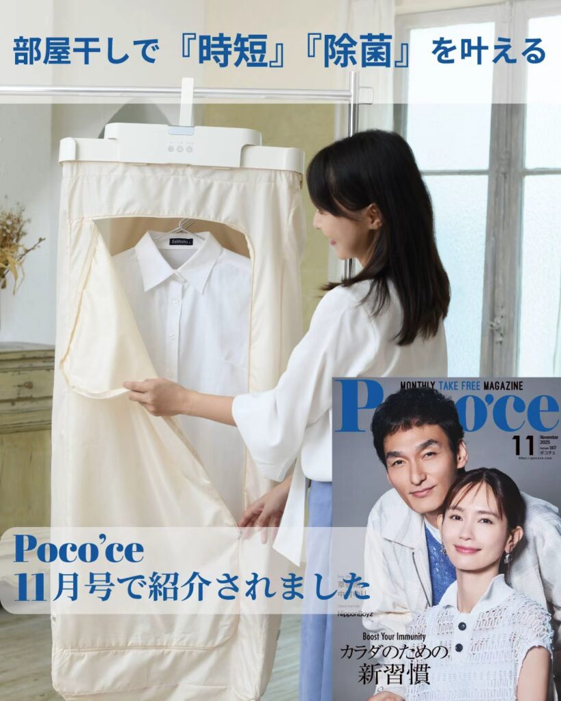 このたび、働く女性向けマガジン「Poco'ce」ポコチェにて「伸縮自在衣類乾燥機」を掲載していただきました。コンパクトなボディながら、時短乾燥と除菌をかなえる機能性が特長です。掲載を通じて、より多くの方に当社製品を知っていただける機会となりました。